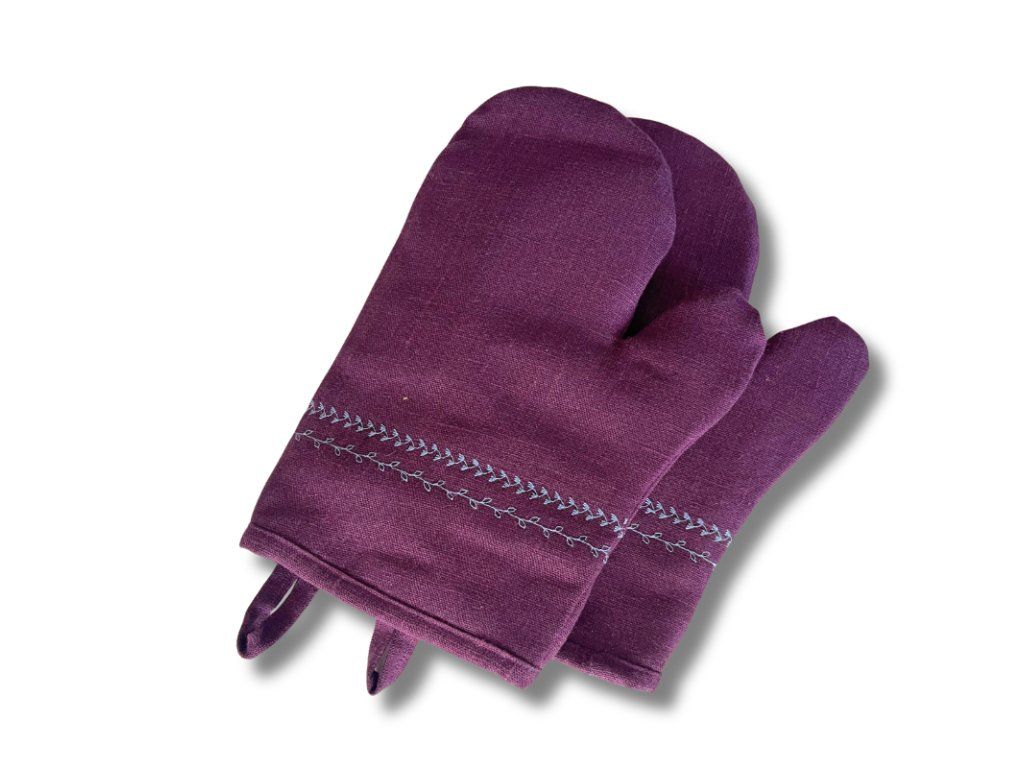 Tyto chňapky jsou ozdobeny jemnou výšivkou. tmavě fialová jemně doplní vaši domácnost a tmavá barva elegantně skryje stopy po vaření. Proměňte každodenní vaření v malý obřad péče a krásy.