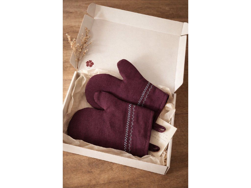 Prémiový pár chňapek v uhrančivé fialové barvě, která velmi sluší tmavě laděným kuchyním, v elegantní krabičce. Spojují přirozenou krásu lněné tkaniny s jednoduchou výšivkou. Budou oddaně pomáhat při vaření a zkrášlí vaši kuchyň.