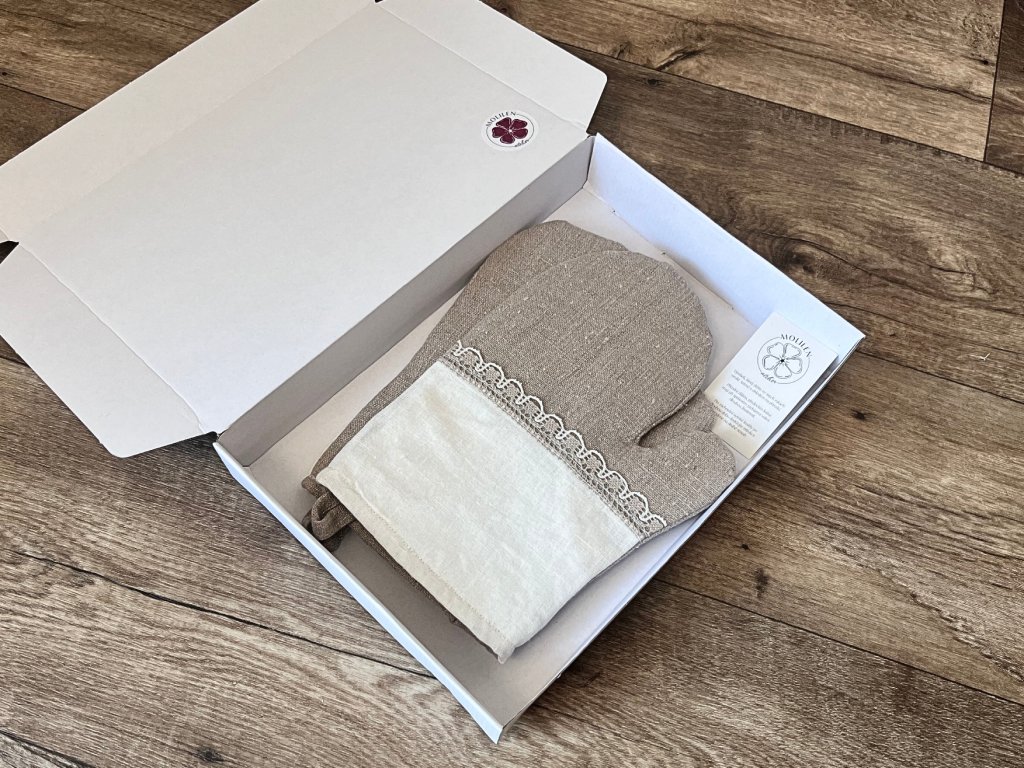 Prémiový pár chňapek z kolekce Naturale v elegantní krabičce. Spojují přirozenou krásu lněné tkaniny s romantickou krajkou, které potěší při každém vaření a zkrášlí vaši kuchyň.