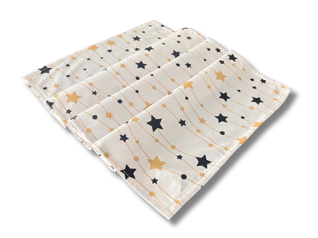Hvězdy zlaté barvy na bílém podkladě zvýrazněné černou. Ústřední motiv Vánoc aneb Betlémská hvězda. Běhoun krásně vynikne samostatně i v kombinaci se slavnostním ubrusem či podtácky a promění každý stůl v místo radosti a klidu.
