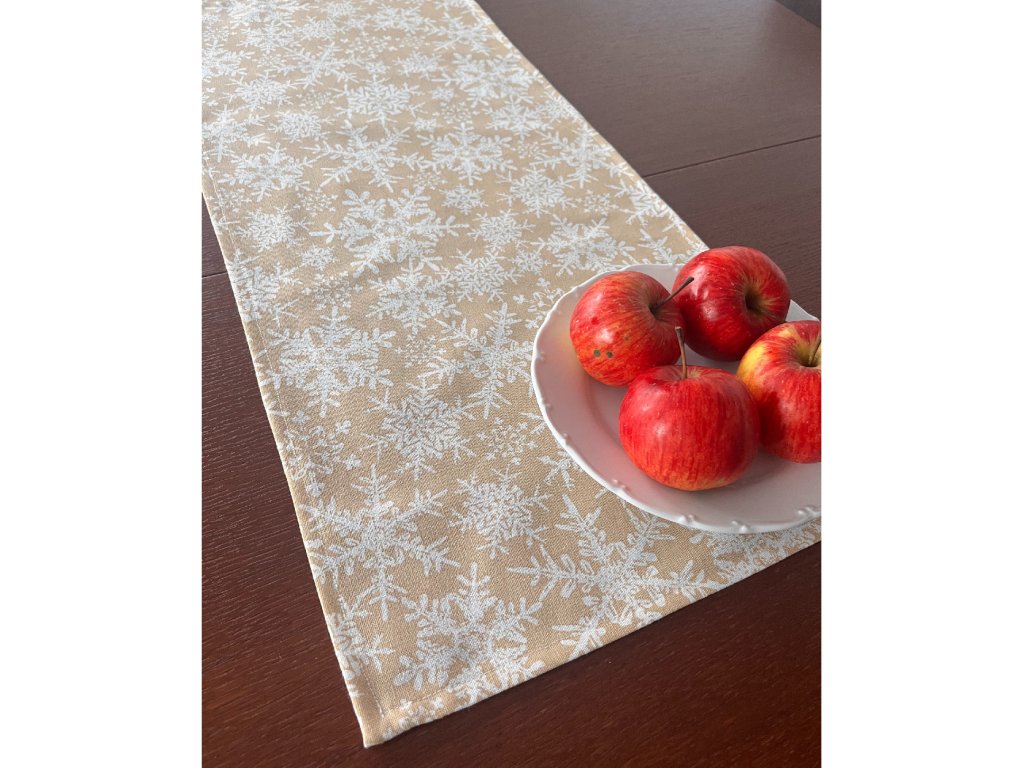 Motiv bílých vloček působí lehce, čistě a dodává interiéru útulnou sváteční atmosféru bez zbytečné okázalosti. Běhoun krásně sjednotí prostřený stůl, zjemní tmavší povrchy a dodá dekoracím – ať už ovocné míse, svíčkám nebo keramickému servisu – příjemně zářivý podklad.